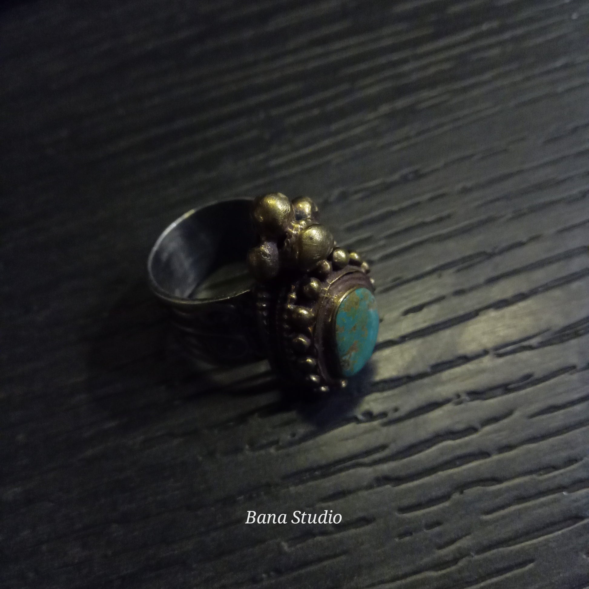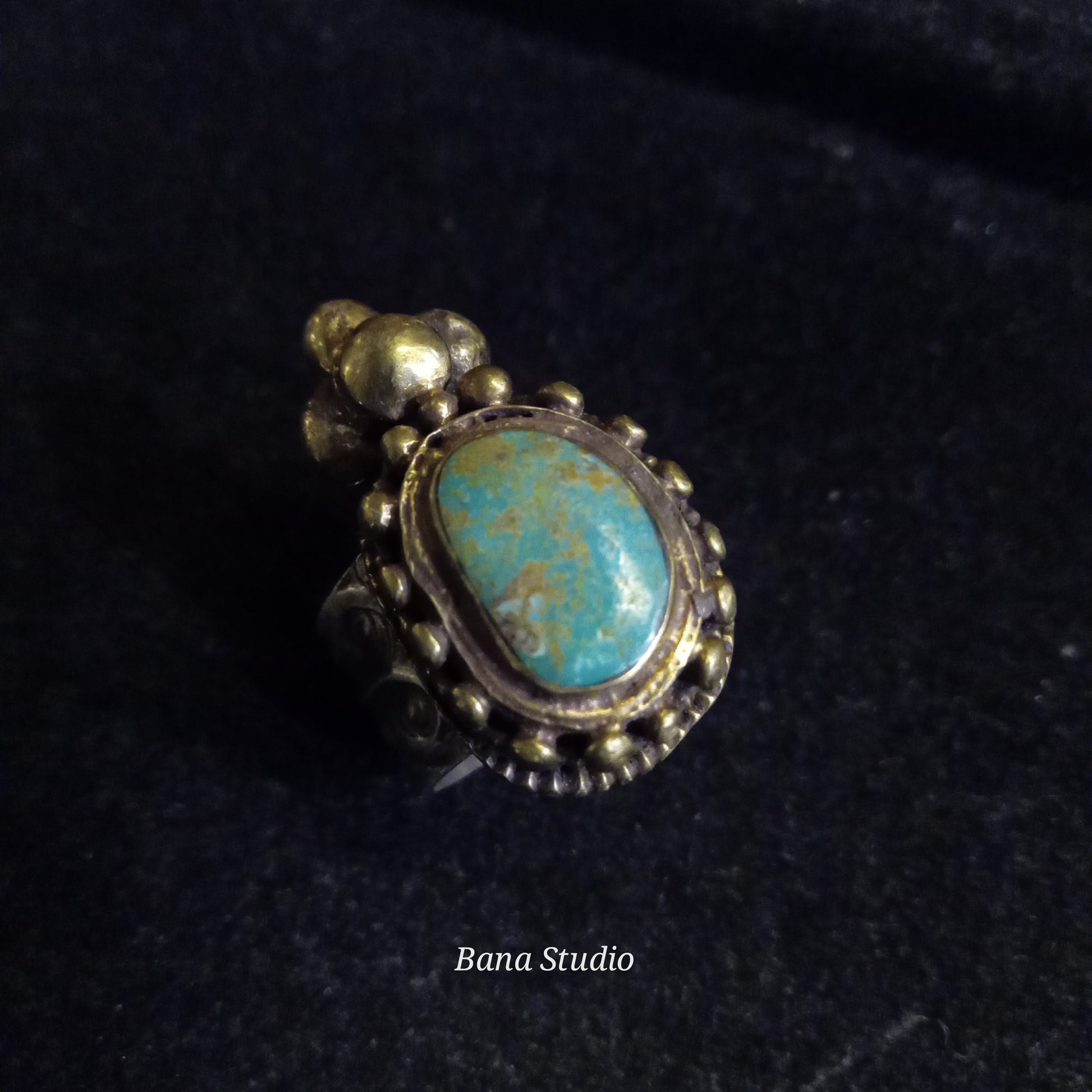 Vintage silver and brass ring from Ladakh studded with real natural turquoise. Size 19